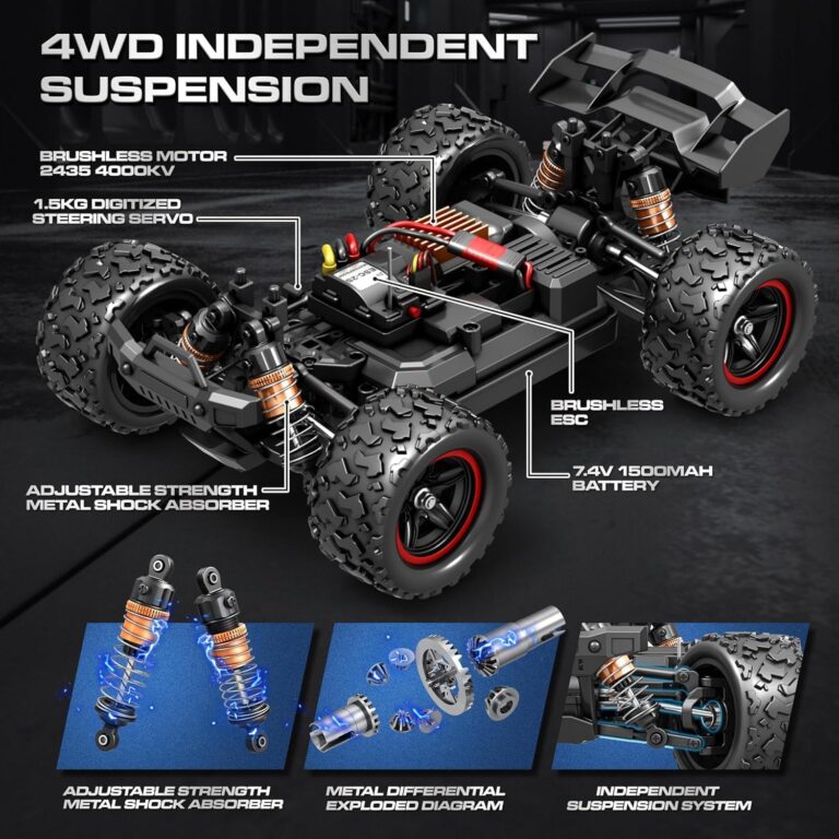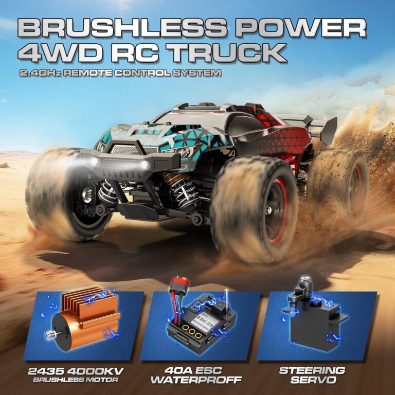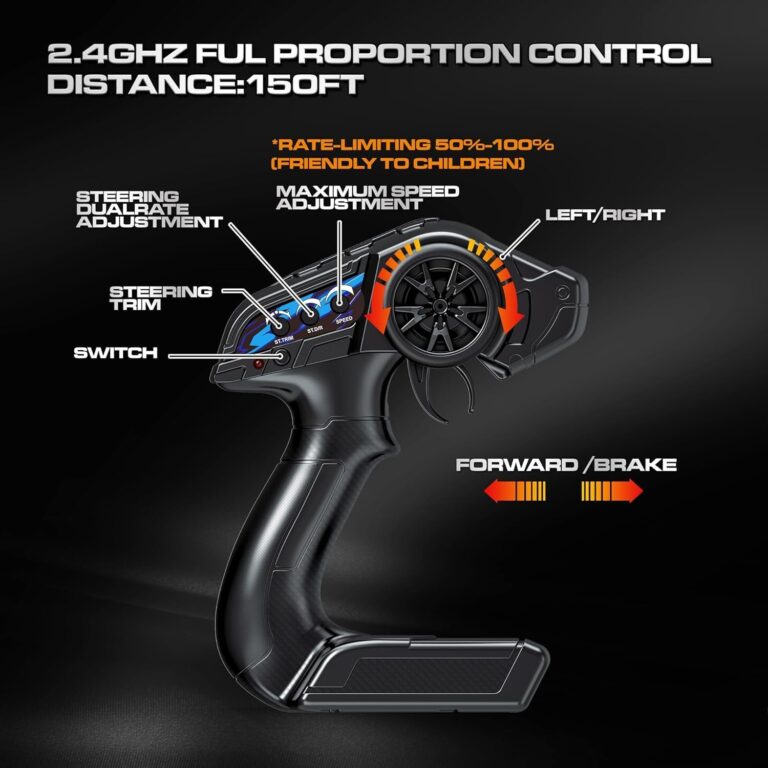 - Transmitter & Brushless ESC: Waterproof brushless ESC on this high speed rc car embodies multiple protections such as over-current, overheat and anti-block prevention, and low battery voltage cutoff. TRIM and SPEED button on the 2.4GHz anti-interference controller. The car’s speed and steering can be controlled proportionally based on the real car great for professional player.
