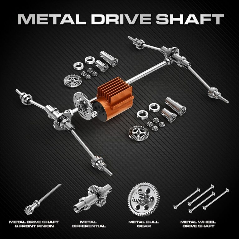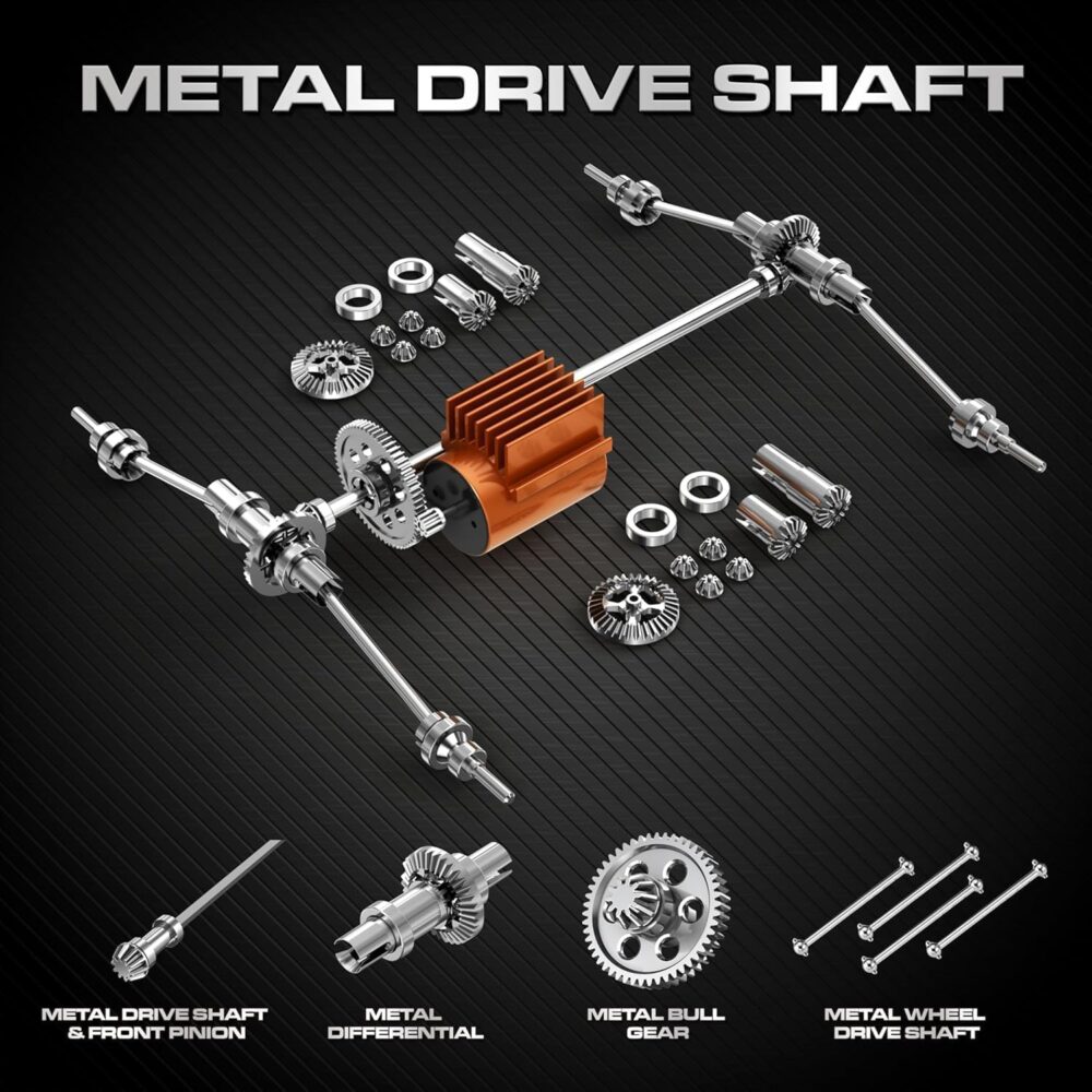 - Shaft Drive 4WD Chassis:The 4×4 RC truck has a new four-wheel drive chassis design that makes the car very reliable in all kinds of terrain and more convenient off-road. Metal gears and metal drive shafts make cars more durable.